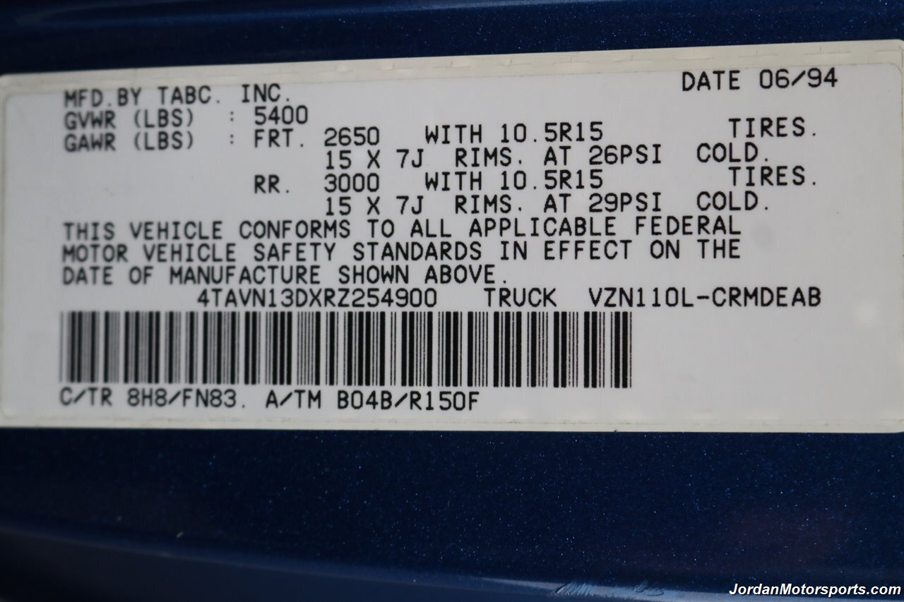 UP FOR GRABS IS A ONCE IN A LIFETIME OPPORTUNITY IMPOSSIBLE TO FIND IN THIS SHAPE AND CONDITION AND SUPER LOW MILES LOCAL OREGON ONE OWNER SINCE NEW CLEAN TITLE AND CARFAX CERTIFIED 1994 TOYOTA PICKUP EXTENDED CAB DX V-6 3.0L WITH A MANUAL 5-SPEED TRANSMISSION, LOADED WITH OPTIONS INCLUDING REAR SLIDER / CRUISE CONTROL / ALLOY WHEELS / TOW PACKAGE / STEREO / CB RADIO / POWER STEERING / TINTED WINDOWS AND MUCH MORE. THIS PICK UP HAS NO SIGNS OR RECORDS OF ANY ACCIDENTS OR DAMAGES EVER, NO MAJOR DENTS OR SCRATCHES AT ALL, LIKE NEW INTERIOR FREE OF ANY RIPS OR TEARS OR ANY BROKEN PLASTICS OR STAINS IN CARPET AT ALL. THE UNDER CARRIAGE OF THIS PICKUP IS LIKE NEW AND IS 100% RUST AND CORROSION FREE, NEVER BEEN OFF ROAD OR DRIVEN IN MUD OR SNOW AT ALL. THE PAINT SHINES LIKE NEW AND HAS NO ISSUES AT ALL OF ANY FADING OR CLEAR COAT PEELING WHAT SO EVER. WE JUST HAD A FULL SERVICE AND REFRESH DONE ON THIS PICKUP INCLUDING HAVING BOTH HEADS REBUILT AND MACHINED WITH NEW VALVES AS WELL / NEW HEAD GASKETS & HEAD BOLTS / NEW AISIN TIMING BELT & WATER PUMP NEW THERMOSTAT / NEW HOSES / NEW INJECTORS / NEW VALVE COVER GASKETS / NEW TENSIONERS & GUIDES / NEW CRANK SHAFT SEAL / NEW SPARK PLUGS - IGNITION WIRES - DISTRIBUTOR CAP - ROTOR & IGNITION COIL / NEW AIR FILTER / NEW OIL CHANGE & FILTER / NEW BATTERY / NEW DRIVING BELTS / NEW COOLANT / NEW WIPER BLADES AND MUCH MORE. WE ALSO REFRESHED THE SUSPENSION WITH ALL NEW FRONT & REAR BILSTEIN SHOCKS, WE ALSO UPGRADED THE TIRES TO A NEW SET OF 32" BF GOODRICH KO2 TIRES ALL THE WAY AROUND. THIS 1994 TOYOTA PICKUP LOOKS BETTER THAN THE DAY IT ROLLED OUT ON THE ASSEMBLY LINE AND HAS BEEN STORED AWAY FOR YEARS AND NOW IT IS READY FOR A NEW CHAPTER IN ITS LIFE, IT HAS BEEN FULLY INSPECTED AND UPDATED AND READY TO GO SO HURRY AND BE THE LUCKY OWNER OF THIS RARE FIND.