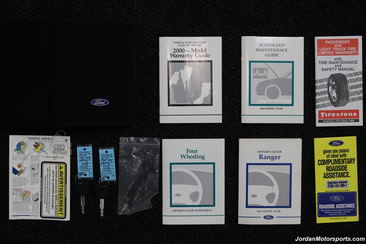 THIS RANGER COMES WITH ALL ORIGINAL BOOKS AND MANUALS AND ALL KEYS. PLUS AS A COURTESY TO OUR CUSTOMERS WE JUST DID A COMPLETE USED VEHICLE INSPECTION AND INSTALLED ALL NEW 30" TOYO OPEN COUNTRY ALL TERRAIN TIRES MOUNTED AND BALANCED, NEW AIR FILTER, WE NOTICED A COUPLE SMALL ROCK CHIPS IN THE WINDOW SO WE REPLACED THE WINDSHIELD INSTALLED NEW WIPER BLADES, NEW FRONT BRAKE PADS & ROTORS, COMPLETE BRAKE FLUID FLUSH, REPLACED THE BRAKE LIGHT BULBS, NEW SERPENTINE BELT, INSPECTED AND TOPPED ALL FLUIDS! YOU'RE NOT LIKELY TO FIND A CLEANER NICER LOWER MILEAGE RANGER FLARE-SIDE ANYWHERE!