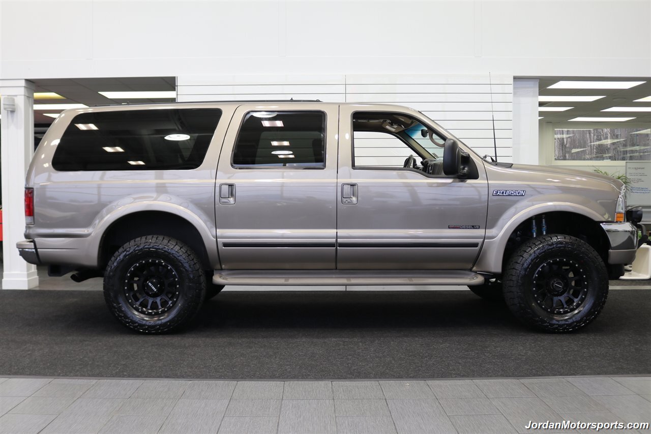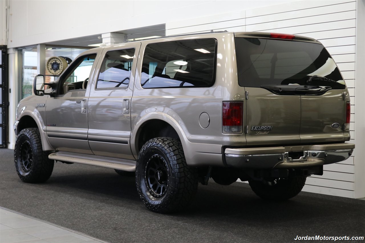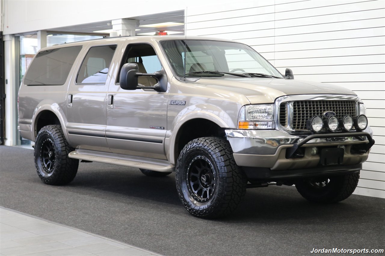 UP FOR GRABS IS A SUPER HARD TO FIND IN THIS SHAPE AND CONDITION AND SUPER LOW MILES LOCAL WEST COAST CALIFORNIA SINCE NEW ALL OF ITS LIFE 2002 FORD EXCURSION LIMITED 4X4 WITH TURBO POWERSTROKE 7.3L ENGINE, LIKE NEW IN AND OUT, NO SIGNS OR RECORDS OF ANY ACCIDENTS EVER, NO MAJOR DENTS OR SCRATCHES AT ALL, LIKE NEW INTERIOR FREE OF ANY RIPS OR TEARS OR ANY STAINS OR NROKEN PLASTICS. THE UNDER CARRIAGE OF THIS EXCURSION IS 100% RUST & CORROSION FREE, NO SIGNS OF EVER BEING DRIVEN IN ANY MUD OR SNOW AT ALL. THIS IS AN 8-PASSENGER LIMITED MODEL, LOADED WITH ALL OFFERED OPTIONS INCLUDING ADJUSTABLE PEDALS, POWER TOWING MIRRORS, POWER REAR VENT WINDOWS, REAR AIR, PARKING SENSORS, RUNNING BOARDS AND MUCH MORE. THIS EXCURSION HAS BEEN LEVEL LIFTED WITH DUAL FRONT BILSTEIN 5100 SERIES SHOCKS ON EACH CORNER, AND UPGRADED 20" METHOD WHEELS WITH ALL NEW 35" FALKEN WILD PEAK A/T 4W 10-PLY TIRES ALL THE WAY AROUND, ALSO COMES WITH FRONT BRUSH GUARD WITH LED SPOT LIGHTS. WE JUST DID A FULL SERVICE ON THIS EXCURSION INCLUDING A FRESH OIL CHANGE & FILTER / NEW AIR FILTER / NEW WIPER BLADES / NEW FRONT SWAY BAR LINKS / NEW HVAC BLOWER MOTOR / FRESH AC CHARGE / NEW DOOR LOCK ACTUATORS / NEW REAR HATCH LIFT SUPPORTS / COOLANT FLUSH AND MUCH MORE. THE INTERIOR AND LEATHER ON THIS EXCURSION HAS BEEN FULLY RECONDITIONED AND IS IN NEW CONDITION, UPGRADED STEREO HEAD UNIT WITH CAPABLE CAR PLAY AND ANDROID AUTO.