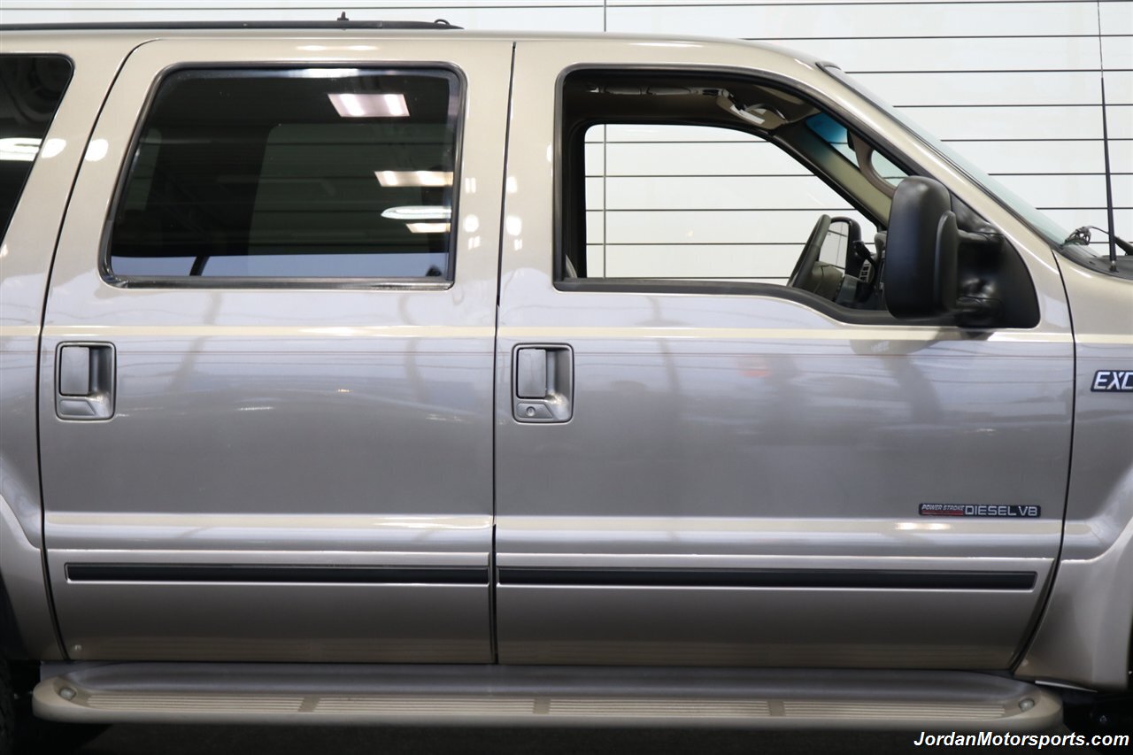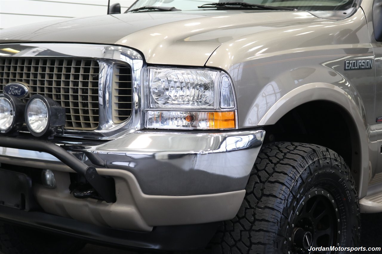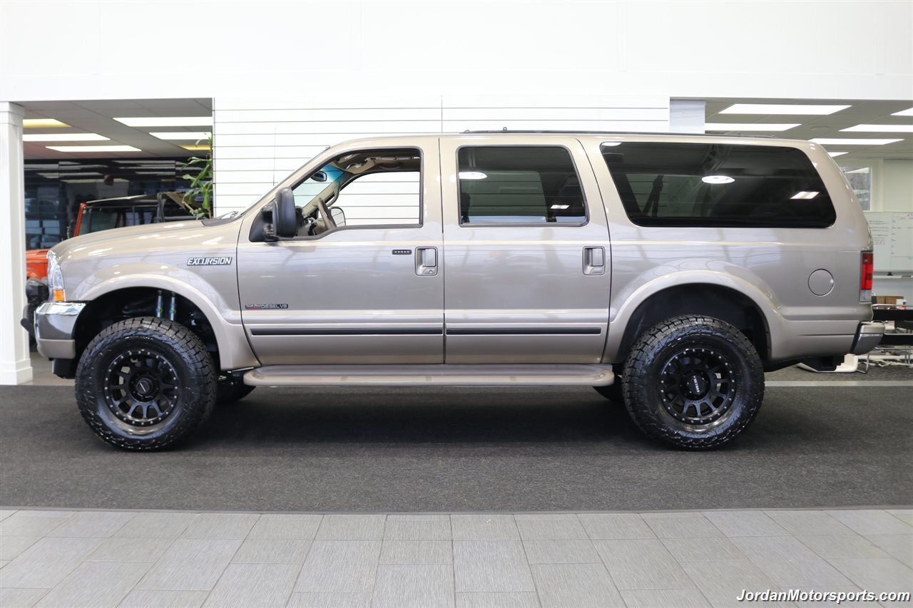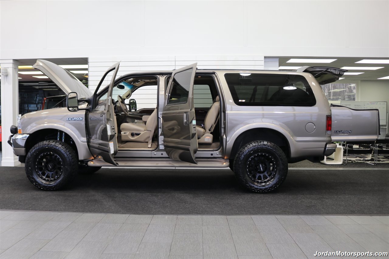 UP FOR GRABS IS A SUPER HARD TO FIND IN THIS SHAPE AND CONDITION AND SUPER LOW MILES LOCAL WEST COAST CALIFORNIA SINCE NEW ALL OF ITS LIFE 2002 FORD EXCURSION LIMITED 4X4 WITH TURBO POWERSTROKE 7.3L ENGINE, LIKE NEW IN AND OUT, NO SIGNS OR RECORDS OF ANY ACCIDENTS EVER, NO MAJOR DENTS OR SCRATCHES AT ALL, LIKE NEW INTERIOR FREE OF ANY RIPS OR TEARS OR ANY STAINS OR NROKEN PLASTICS. THE UNDER CARRIAGE OF THIS EXCURSION IS 100% RUST & CORROSION FREE, NO SIGNS OF EVER BEING DRIVEN IN ANY MUD OR SNOW AT ALL. THIS IS AN 8-PASSENGER LIMITED MODEL, LOADED WITH ALL OFFERED OPTIONS INCLUDING ADJUSTABLE PEDALS, POWER TOWING MIRRORS, POWER REAR VENT WINDOWS, REAR AIR, PARKING SENSORS, RUNNING BOARDS AND MUCH MORE. THIS EXCURSION HAS BEEN LEVEL LIFTED WITH DUAL FRONT BILSTEIN 5100 SERIES SHOCKS ON EACH CORNER, AND UPGRADED 20" METHOD WHEELS WITH ALL NEW 35" FALKEN WILD PEAK A/T 4W 10-PLY TIRES ALL THE WAY AROUND, ALSO COMES WITH FRONT BRUSH GUARD WITH LED SPOT LIGHTS. WE JUST DID A FULL SERVICE ON THIS EXCURSION INCLUDING A FRESH OIL CHANGE & FILTER / NEW AIR FILTER / NEW WIPER BLADES / NEW FRONT SWAY BAR LINKS / NEW HVAC BLOWER MOTOR / FRESH AC CHARGE / NEW DOOR LOCK ACTUATORS / NEW REAR HATCH LIFT SUPPORTS / COOLANT FLUSH AND MUCH MORE. THE INTERIOR AND LEATHER ON THIS EXCURSION HAS BEEN FULLY RECONDITIONED AND IS IN NEW CONDITION, UPGRADED STEREO HEAD UNIT WITH CAPABLE CAR PLAY AND ANDROID AUTO.