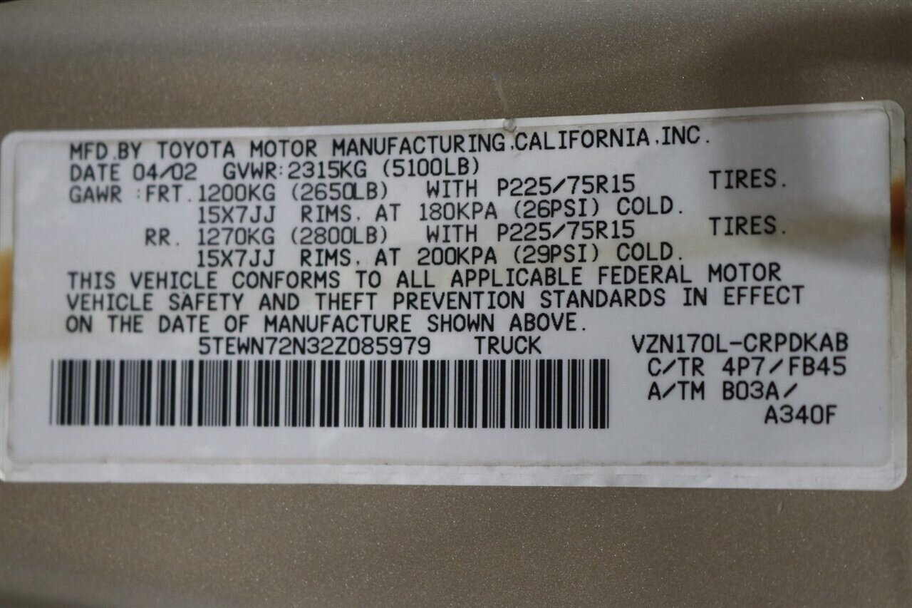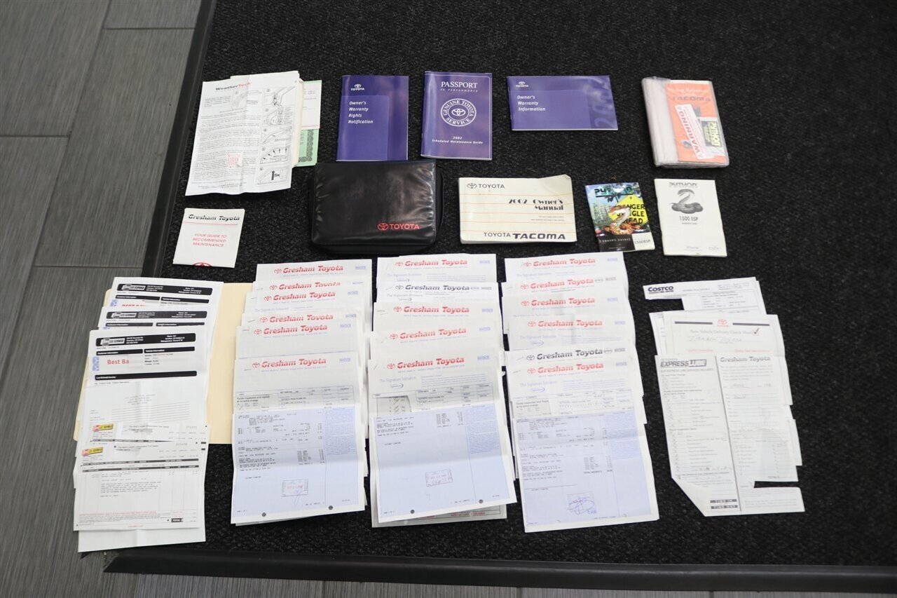 UP FOR GRABS IS A SUPER HARD TO FIND IN THIS SHAPE AND CONDITION AND SUPER LOW MILES LOCAL OREGON ONE OWNER SINCE NEW CLEAN TITLE AND CARFAX CERTIFIED FRESH TRADE IN 2002 TOYOTA TACOMA EXTENDED CAB 4X4 V-6 SR5 WITH ONLY 89K ORIGINAL MILES, LIKE NEW IN AND OUT, NO SIGNS OR RECORDS OF ANY ACCIDENTS OR DAMAGES EVER, NO MAJOR DENTS OR SCRATCHES AT ALL IF ANY, LIKE NEW INTERIOR FREE OF ANY RIPS OR TEARS OR ANY BROKEN PLASTICS OR STAINS ON THE CARPET. THIS TACOMA HAS NEVER BEEN OFF ROAD OR DRIVEN IM MUD OR SNOW AT ALL, THE UNDER CARRIAGE IS 100% RUST FREE WITH ZERO CORROSION. WE JUST DID A FULL SERVICE ON THIS TACOMA INCLUDING A FULL OEM AISIN TIMING BELT & WATER PUMP SERVICE WITH TENSIONERS & GUIDES / NEW THERMOSTAT WITH SEAL / COOLANT FLUSH / NEW SPARK PLUGS / NEW PCV VALVE / NEW FRONT BRAKES & ROTORS / BRAKE FLUID FLUSH / NEW RACK & PINION BUSHING KIT / OIL CHANGE & FILTER / NEW AIR FILTER AND MORE. ALSO THIS TACOMA WAS A GRANDPA OLD MAN TRUCK 100% STOCK AND WE JUST OUTFITTED IT WITH OUR OVERLAND PKG INCLUDING A NEW 2.5" ADJUSTABLE BILSTEIN TOYTEC LEVELING KIT WITH DIFFERENTIAL DROPS AND BILSTEIN 5100 SERIES SHOCKS ALL THE WAY AROUND, WE ALSO UPGRADED IT WITH NEW OEM FACTORY TOYOTA TRD PRO FORGED WHEELS AND NEW 33" FALKEN WILD PEAK A/T 4W SL LOAD TIRES ALL THE WAY AROUND AND WE UPGRADED THE HEADLIGHTS / TURN SIGNALS AND MARKERS TO NEW BLACK HOUSING PKG. THIS TACOMA COMES WITH A LEER FRAMELESS INSULATED CANOPY AND A SPRAY IN BED LINER, THE BED IS IN EXCELLENT CONDITION AS WELL. THIS TACOMA COMES WITH ALL ORIGINAL BOOKS AND MANUALS AND ALL SERVICE RECORDS SINCE NEW AT TOYOTA DEALER. THIS IS COLLECTOR GRADE AND IMPOSSIBLE TO FIND WITH LOWER MILES OR A CLEANER UNDER CARRIAGE.