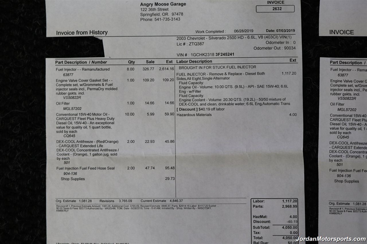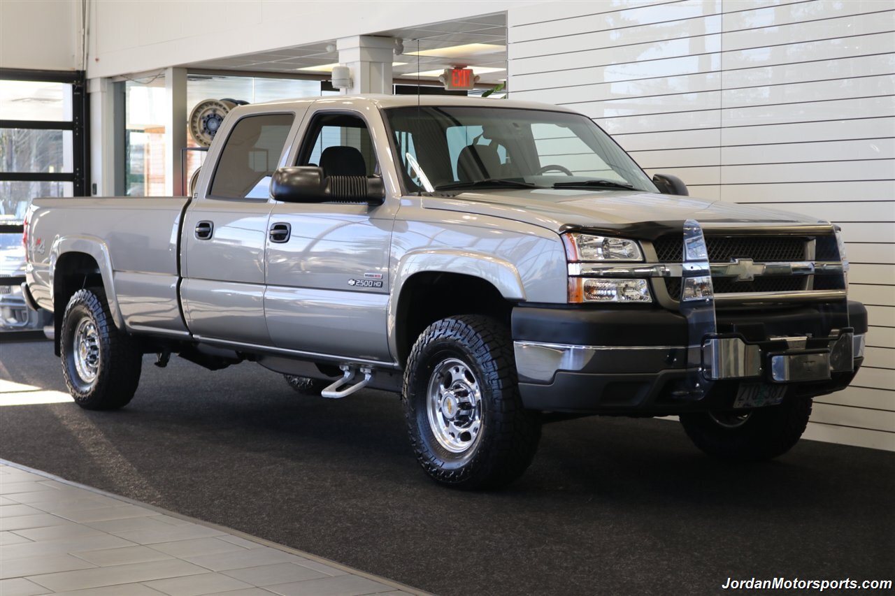 UP FOR GRABS IS A SUPER HARD TO FIND IN THIS SHAPE AND CONDITION AND SUPER LOW MILES LOCAL ONE OWNER SINCE NEW 2003 CHEVROLET SILVERADO 2500HD CREW CAB LONG BED 4X4 WITH ONLY 94K MILES, LIKE NEW IN AND OUT, NO SIGNS OR RECORDS OF ANY ACCIDENTS OR DAMAGES EVER, NO MAJOR DENTS OR SCRATCHES AT ALL, LIKE NEW INTERIOR FREE OF ANY RIPS OR TEARS OR ANY BROKEN PLASTICS, THE UNDER CARRIAGE OF THIS SILVERADO IS 100% RUST & CORROSION FREE, NO SIGNS OF EVER BEING DRIVEN IN MUD OR SNOW AT ALL. THIS TRUCK IS 100% STOCK AND UNMODIFIED, NEVER TUNED OR CHIPPED , WE JUST ADDED A NEW BILSTEIN 5100 FRONT LEVELING KIT WITH ALL NEW FRONT AND REAR BILSTEIN 5100 SERIES SHOCKS AND UPGRADED THE TIRES TO ALL NEW 33" FALKEN WILDPEAK A/T 4W 10-PLY TIRES ALL THE WAY AROUND AND A NEW ALIGNMENT. THIS IS A LOADED SILVERADO THAT COMES WITH 6-PASSENGER SEATING, UPGRADED FRONT BRUSH GUARD WITH BUILT IN WARN WINCH, POWER EXTENDABLE TOWING MIRRORS, TINTED WINDOWS, POWER SEAT, PAINT MATCHED FENDER FLARES, SPRAY IN BED LINER AND A BED THAT IS IN NEW CONDITION. THIS IS A VERY WELL CARED FOR AND SERVICED SILVERADO, THE PREVIOUS OWNER JUST DID A FULL SERVICE ON IT 4K MLS AGO ICLUDING ALL NEW INJECTORS AND VALVE COVER GASKETS AND MUCH MORE. WE ALSO JUST DID A FRESH SERVICE ON IT INCLUDING OIL CHANGE & FILTER / NEW AIR FILTER / NEW IDLER CONTROL ARM W/BRACKET / NEW INTERMEDIATE STEERING SHAFT / NEW SERPENTINE BELT / NEW HIGH PRESSURE POWER STEERING HOSE / NEW HYDRO-BOOST TO GEAR BOX HOSE / POWER STEERING FLUSH / COOLANT FLUSH / AC FRESH RECHARGE / BATTERY SERVICE AND MUCH MORE. THIS TRUCK HAS ZERO OIL LEAKS, ZERO KNOWN ISSUES AND COMPLETLY SORTED AND READY FOR A NEW HOME.