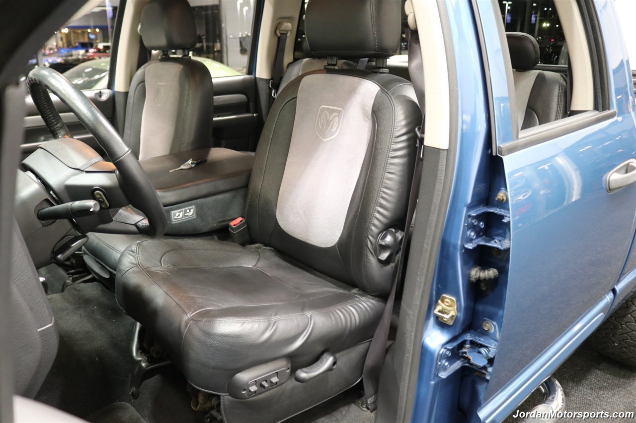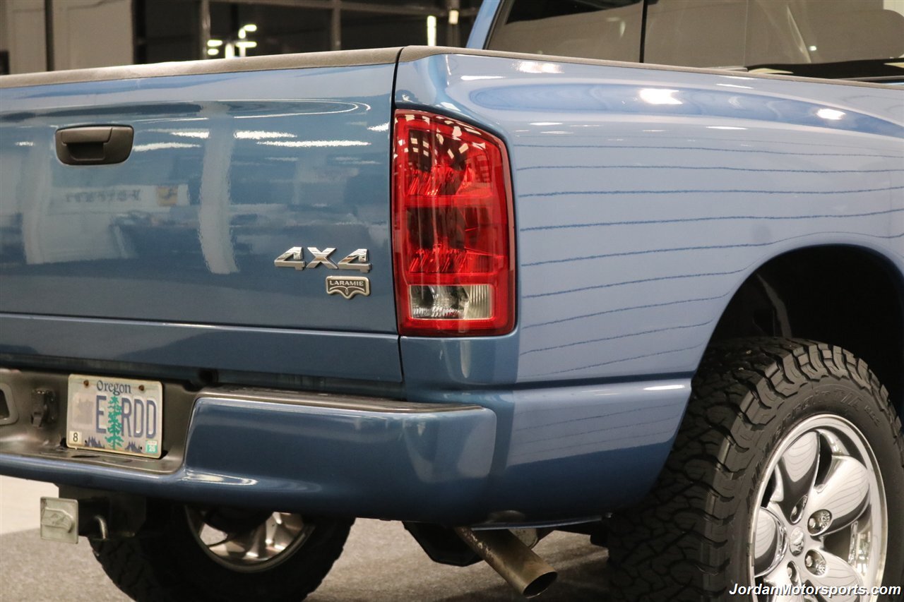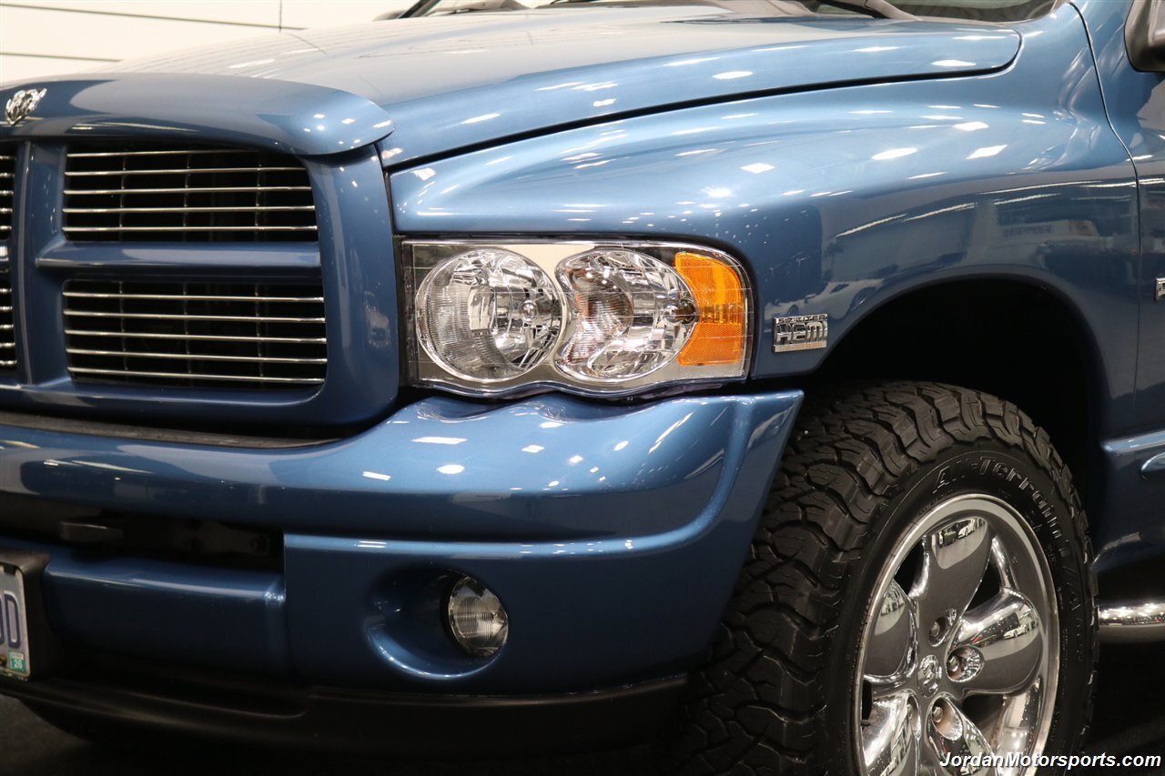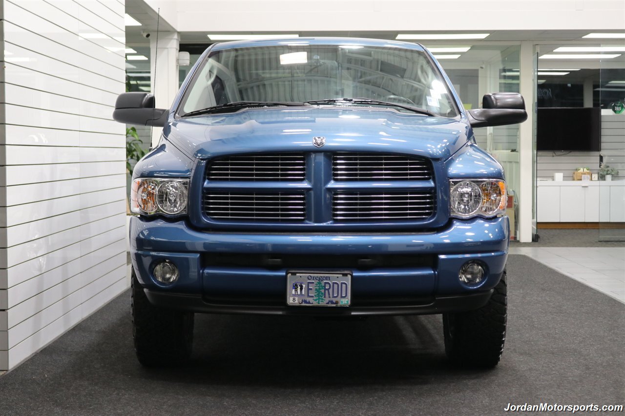 UP FOR GRABS IS A SUPER HARD TO FIND IN THIS SHAPE AND CONDITION AND SUPER LOW MILES LOCAL OREGON SINCE NEW 1-OWNER CLEAN TITLE AND CARFAX CERTIFIED FRESH TRADE IN 2004 DODGE RAM 1500 QUAD CAB SHORT BED SPORT 4X4 LARAMIE WITH 5.7L V8 HEMI ENGINE AND ONLY 66K ACTUAL MILES, LIKE NEW IN AND OUT, NO SIGNS OR RECORDS OF ANY ACCIDENTS EVER, NO MAJOR DENTS OR SCRATCHES AT ALL, LIKE NEW NON-SMOKER INTERIOR FREE OF ANY RIPS OR TEARS OR ANY BROKEN PLASTICS OR STAINS ON CARPET. THE PAINT SHOWS IN EXCELLENT CONDITION WITH NO CLEAR COAT PEELING OR FADING, THE UNDER CARRIAGE OF THIS RAM IS 100% RUST & CORROSION FREE, NO SIGNS OF THIS RAM EVER BEING DRIVEN IN ANY MUD OR SNOW AT ALL. THIS IS THE TOP OF THE LINE FOR THE YEAR TRIM PACKAGE, COMES WITH 6-PASSENGER SEATING, HEATED LEATHER DUAL POWER SEATS, INFINITI SOUND SYSTEM, TINTED WINDOWS, REAR SLIDER, 20" FACTORY CHROME WHEELS WITH BRAND NEW 34" BF GOODRICH KO3 TIRES ALL THE WAY AROUND, RUNNING BOARDS, TOWING MIRRORS, ADJUSTABLE PEDALS, SPRAY IN BED LINER AND MUCH MORE. THIS RAM HAS PAINT MATCHED BUMPERS ALONG WITH FRONT GRILL AND UPGRADED FRONT BUG SHIELD. THIS RAM HAS BEEN OWNED BY THE SAME OWNER SINCE NEW FOR THE LAST 22 YEARS, ALL SERVICE RECORDS SINCE NEW ARE PART OF THIS SALE, THE PREVIOUS OWNER JUST DID A FULL MAJOR SERVICE ON IT PRIOR TO SELLING IT TO US INCLUDING ALL NEW FLUIDS IN TRANSMISSION - FRONT DIFFERENTIAL - REAR DIFFERENTIAL TRANSFER CASE - POWER STEERING FLUID AND MORE. WE ALSO JUST DID A NEW OIL CHANGE AND FILTER / NEW AIR FILTER / NEW WIPER BLADES / NEW FRONT BRAKES & ROTORS / BRAKE FLUID FLUSH / COOLANT FLUSH / AC RECHARGE / NEW DRIVERS SEAT MOTOR AND ALL NEW TIRES. THIS RAM COMES WITH ALL ORIGINAL BOOKS AND MANUALS / 2 SETS OF KEYS & REMOTES AND EVERY SERVICE RECORD SINCE NEW.