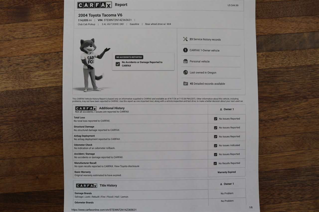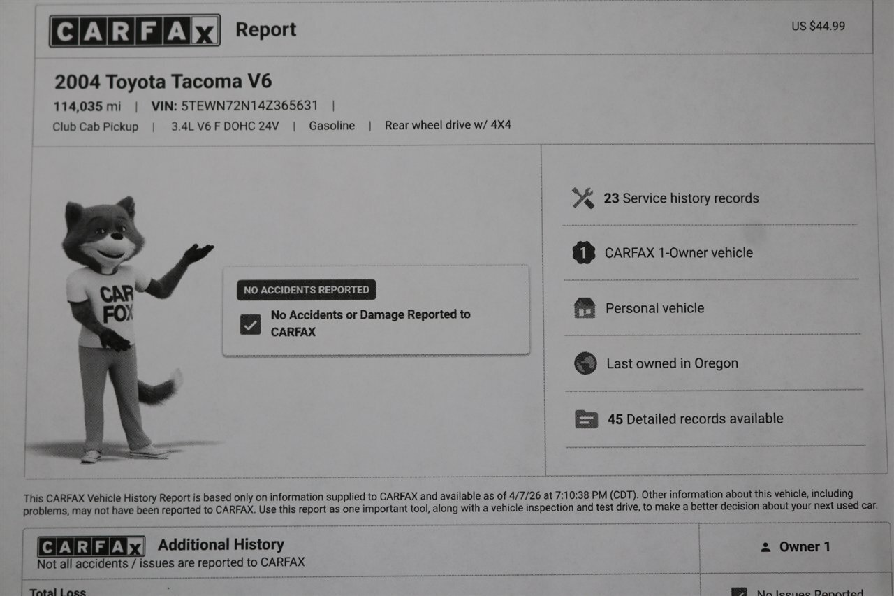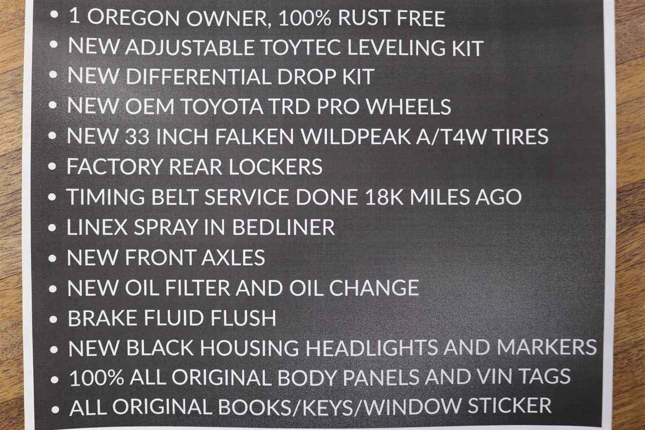 UP FOR GRABS IS A LOCAL 1-OWNER OREGON RUST FREE TACOMA, NO SIGNS OR RECORDS OF ANY ACCIDENTS OR DAMAGES EVER, NON SMOKER, NO MAJOR DENTS OR SCRATCHES AT ALL, EXCELLENT CONDITION INTERIOR AND CARPET, TINTED WINDOWS, REAR SLIDER, UPGRADED FRONT PIAA LIGHTS, BUG SHIELD AND MORE. THIS TACOMA HAS BEEN OWNED AND DRIVEN BY THE SAME OWNER SINCE NEW AND WE PURCHASED IT IN 100% STOCK CONDITION, WE UPGRADED IT WITH OUR OVERLAND PACKAGE. THIS TACOMA ALSO COMES WITH ALL ORIGINAL BOOKS & MANUALS AND 2 SETS OF KEYS AND THE ORIGINAL WINDOW STICKER.