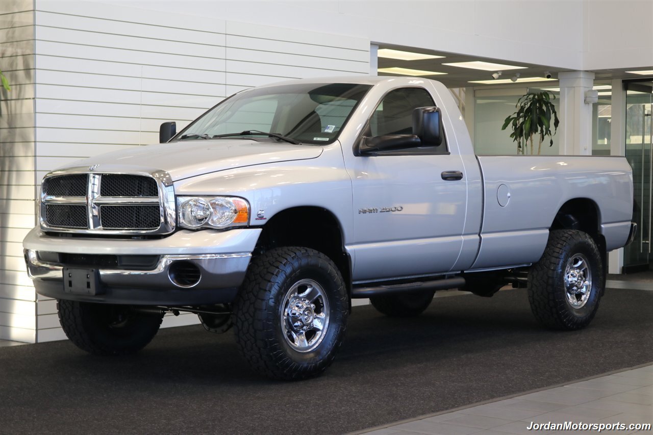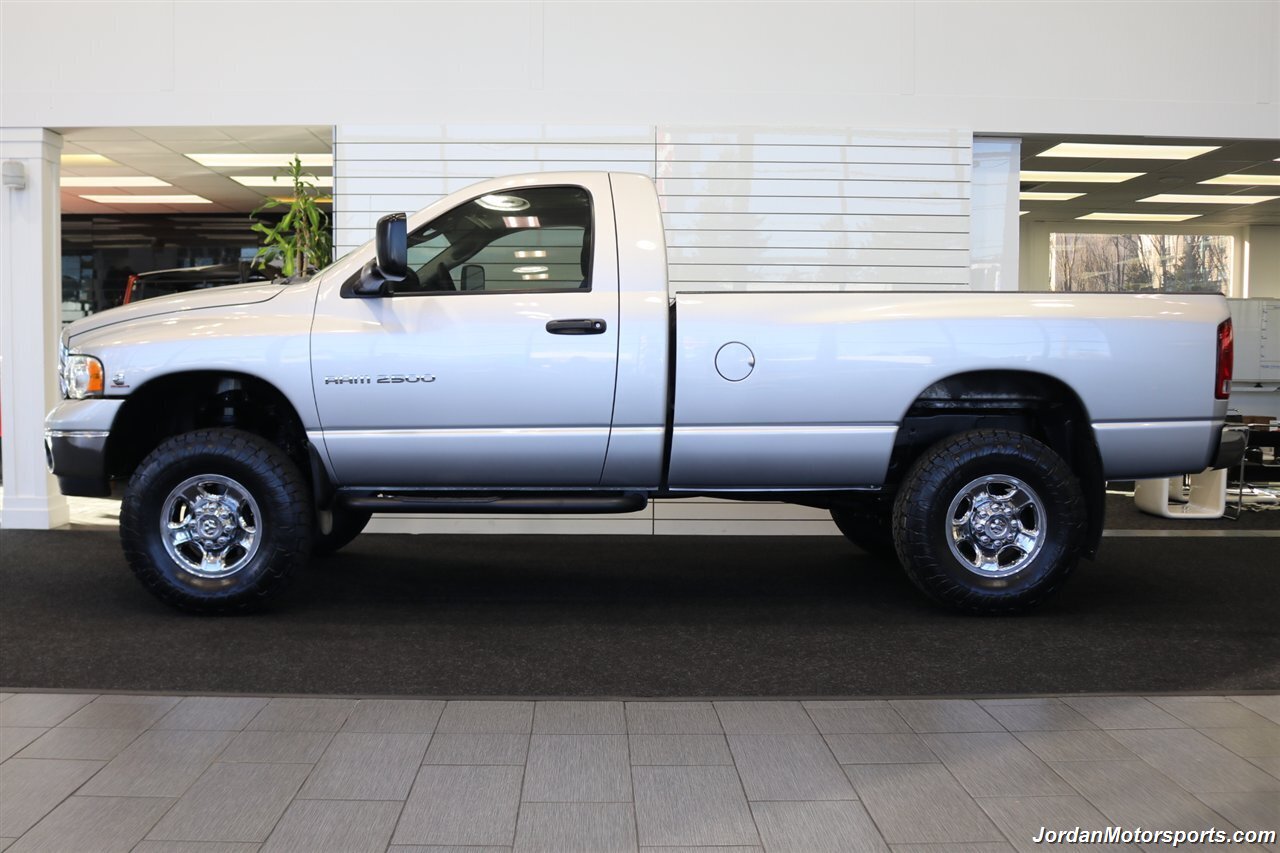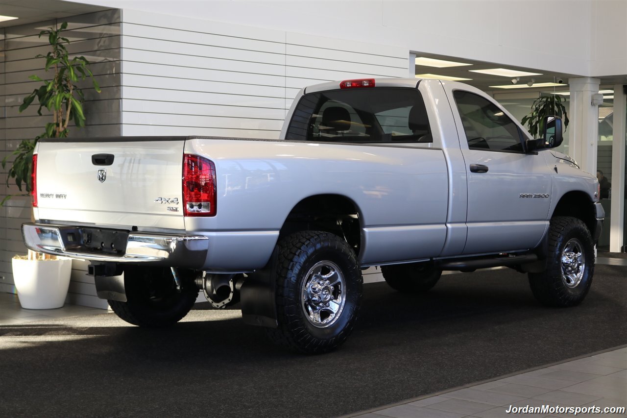 UP FOR GRABS IS A SUPER HARD TO FIND IN THIS SHAPE AND CONDITION AND SUPER LOW MILES FRESH TRADE IN CLEAN TITLE AND CARFAX CERTIFIED 2005 DODGE RAM 2500 SINGLE CAB SLT 4X4 TURBO CUMMINS 5.9L HIGH OUTPUT WITH ONLY 109K MLS, LIKE NEW IN AND OUT, NO SIGNS OR RECORDS OF ANY ACCIDENTS OR DAMAGES EVER, NO MAJOR DENTS OR SCRATCHES AT ALL, LIKE NEW INTERIOR FREE OF ANY RIPS OR TEARS OR ANY BROKEN PLASTICS WHAT SO EVER, NON-SMOKER, LOADED WITH ALL POWER OPTIONS FROM THE FACTORY INCLUDING ALL POWER WINDOWS & LOCKS, TOWING MIRRORS, RUNNING BOARDS, SPRAY IN BED LINER, 5TH WHEEL HOOK UP, REAR AIRBAGS, TOW PACKAGE, TRAILER BRAKES, TINTED WINDOWS AND MUCH MORE. THE UNDER CARRIAGE IS 100% RUST & CORROSION FREE AND SHOWS NO SIGNS OF EVER BEING DRIVEN OFF ROAD OR IN MUD OR SNOW AT ALL. THIS TRUCK CAME TO US AND WAS 100% IN STOCK CONDITION, NOTHING MECHANICALLY HAS EVER BEEN MODIFIED AND IT REMAINS THE SAME WAY, WE JUST UPGRADED THE SUSPENSION WITH A NEW 2.5" BILSTEIN LEVEL KIT AND ALL 4 NEW BILSTEIN 5100 SERIES SHOCKS ALL THE WAY AROUND ALONG WITH ALL 4 NEW 35" TOYO OPEN COUNTRY A/T III 10-PLY TIRES ALL THE WAY AROUND, THIS TRUCK HAS NEVER BEEN TUNED OR MODIFIED AT ALL. THIS TRUCK WAS DRIVEN 5K MILES A YEAR AND IT WAS ALL HIGHWAY DRIVING FOR A SNOWBIRD OWNER BETWEEN IDAHO AND ARIZONA TOWING HIS CAMPER, IT HAS ALWAYS BEEN SERVICED AND VERY WELL CARED FOR AND SERVICED ON TIME, ALL BELTS AND BATTERIES ALMOST BRAND NEW ALONG WITH FLUIDS, JUST HAD A COMPLETE TRANSMISSION SERVICE INCLUDING A NEW TRANSMISSION VALVE BODY AND NEW GASKETS AND FLUIDS. WEALSO JUST DID A FRESH OIL CHANGE AND FILTER / COOLANT FLUSH / AC FRESH CHARGE / BATTERY SERVICE AND MORE.