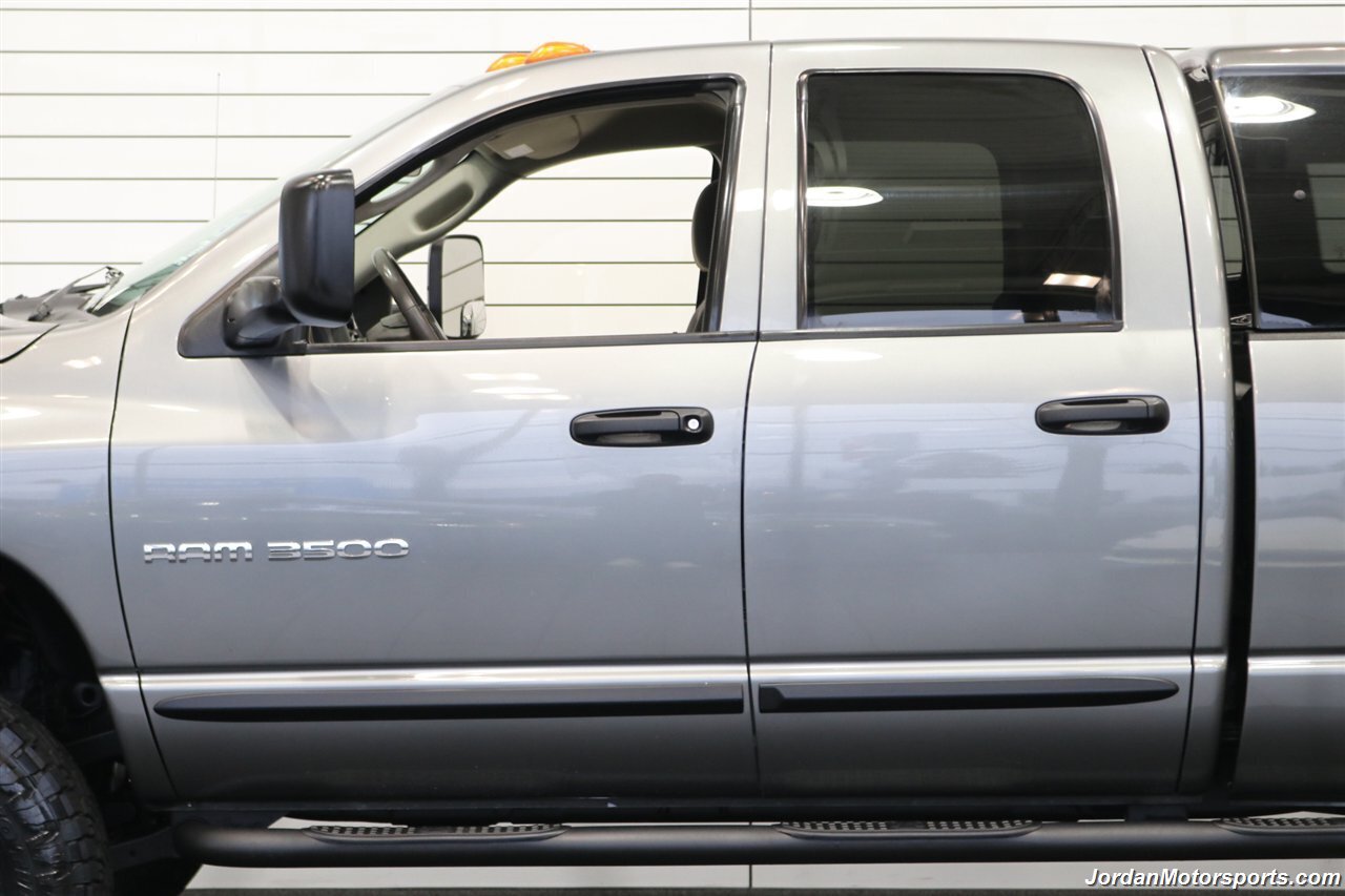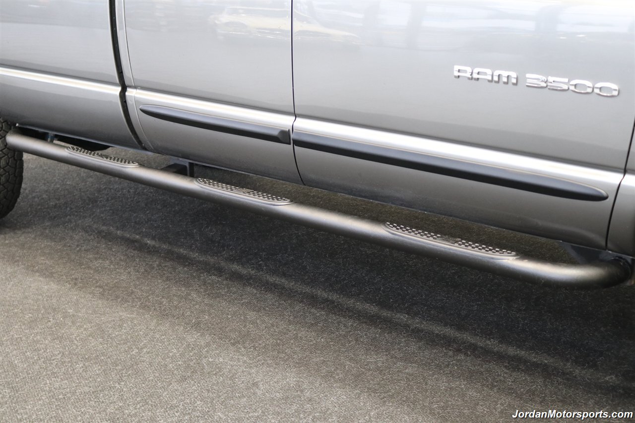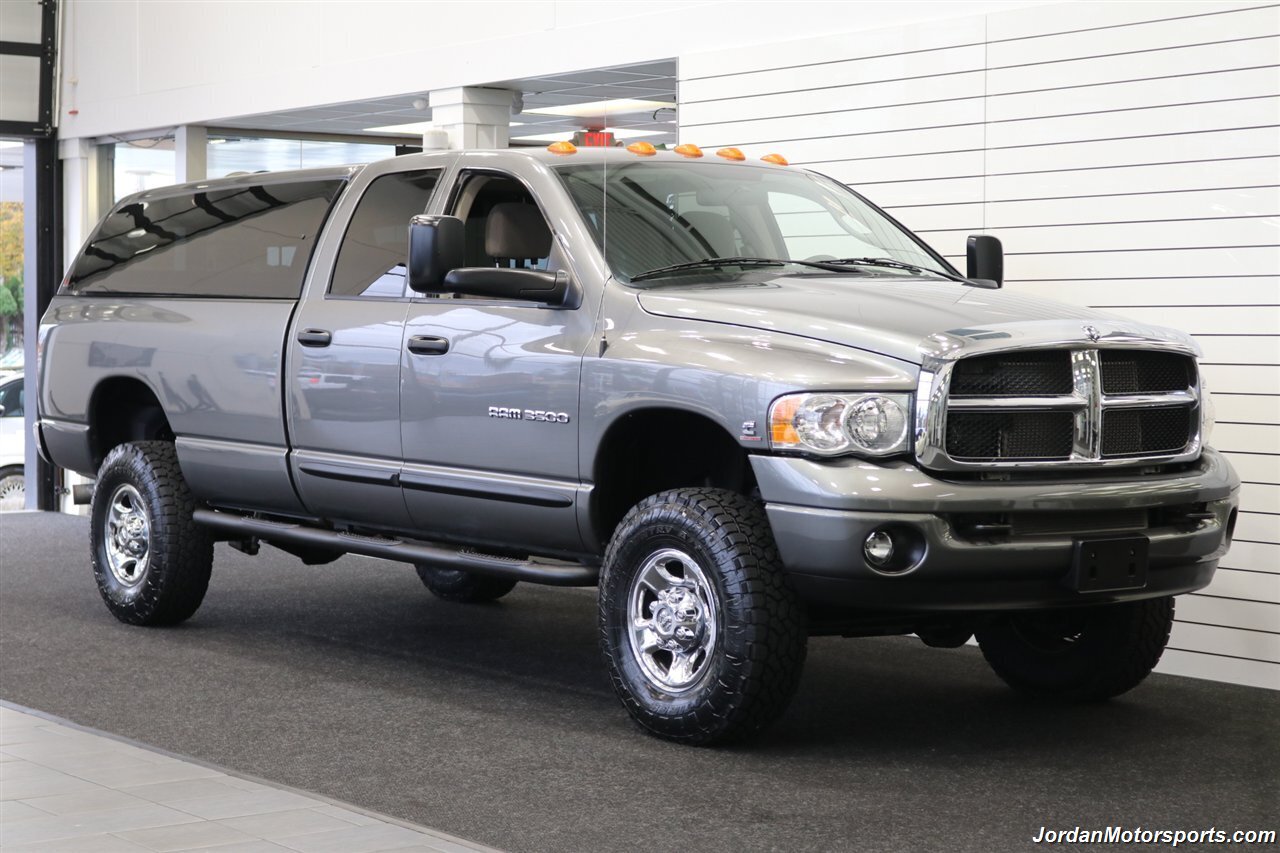 UP FOR GRABS IS A SUPER HARD TO FIND IN THIS SHAPE AND CONDITION AND LOW MILES LOCAL WEST COAST SINCE NEW FRESH TRADE IN CLEAN TITLE AND CARFAX CERTIFIED 2005 DODGE RAM 3500 CREW CAB LONG BED SLT 4X4 WITH TURBO CUMMINS 5.9L AND 6-SPEED MANUAL TRANSMISSION, LOADED UP WITH ALL OPTIONS OFFERED BY DODGE FOR THE YEAR INCLUDING 6-PASSENGER SEATING, FRONT FOG LIGHTS, EXTENDABLE TOWING MIRRORS, FULL LENGTH RUNNING BOARDS, ALL POWER OPTIONS, LINEX SPRAY IN BED LINER, LEER PAINT MATCHED INSULATED TOP OF THE LINE CANOPY AND MUCH MORE. NO SIGNS OR RECORDS OF ANY ACCIDENTS EVER, NO MAJOR DENTS OR SCRATCHES AT ALL, LIKE NEW INTERIOR FREE OF ANY RIPS OR TEARS OR ANY BROKEN PLASTICS, NON-SMOKER PREVIOUS OWNER. THIS TRUCK HAS NO ENGINE MODIFICATIONS WHAT SO EVER, ADULT OWNED ALL OF ITS LIFE, NEVER BEEN OFF ROAD, NEVER HAD A 5TH WHEEL OR GOOSENECK INSTALLED AT ALL, EXCELLENT CONDITION BED, UPGRADED EXHAUST, FRESHLY FULLY SERVICED WITH A FRESH OIL CHANGE & FILTER / NEW DOOR LOCK ACTUATOR / 2-NEW BATTERIES / NEW AIR FILTER / NEW WIPER BLADES / NEW STEERING BOX / POWER STEERING FLUID FLUSH AND CHANGE / NEW SERPENTINE BELT / AC RECHARGE AND MORE. WE ALSO JUST UPGRADED THE SUSPENSION WITH A NEW 3" CARLI LEVEL LIFT WITH ALL NEW FRONT AND REAR BILSTEIN 5100 SERIES SHOCKS ALL THE WAY AROUND AND NEW 34" TOYO OPEN COUNTRY A/T III 10-PLY TIRES. THE PREVIOUS OWNERS JUST DID A FULL FRONT END REBUILT ABOUT 12K MILES AGO INCLUDING ALL NEW BALL JOINTS AND LINKAGES AS WELL AS TRAC BAR AND LINKAGE ASSEMBLY, THEY ALSO JUST HAD ALL NEW BRAKES - ROTORS - CALIPERS -AXLE SEALS AND MORE UPGRADED AS WELL NEW AC CONDESNSOR AND EVAPORATOR AND EXPANSION VALVE REPLACED.