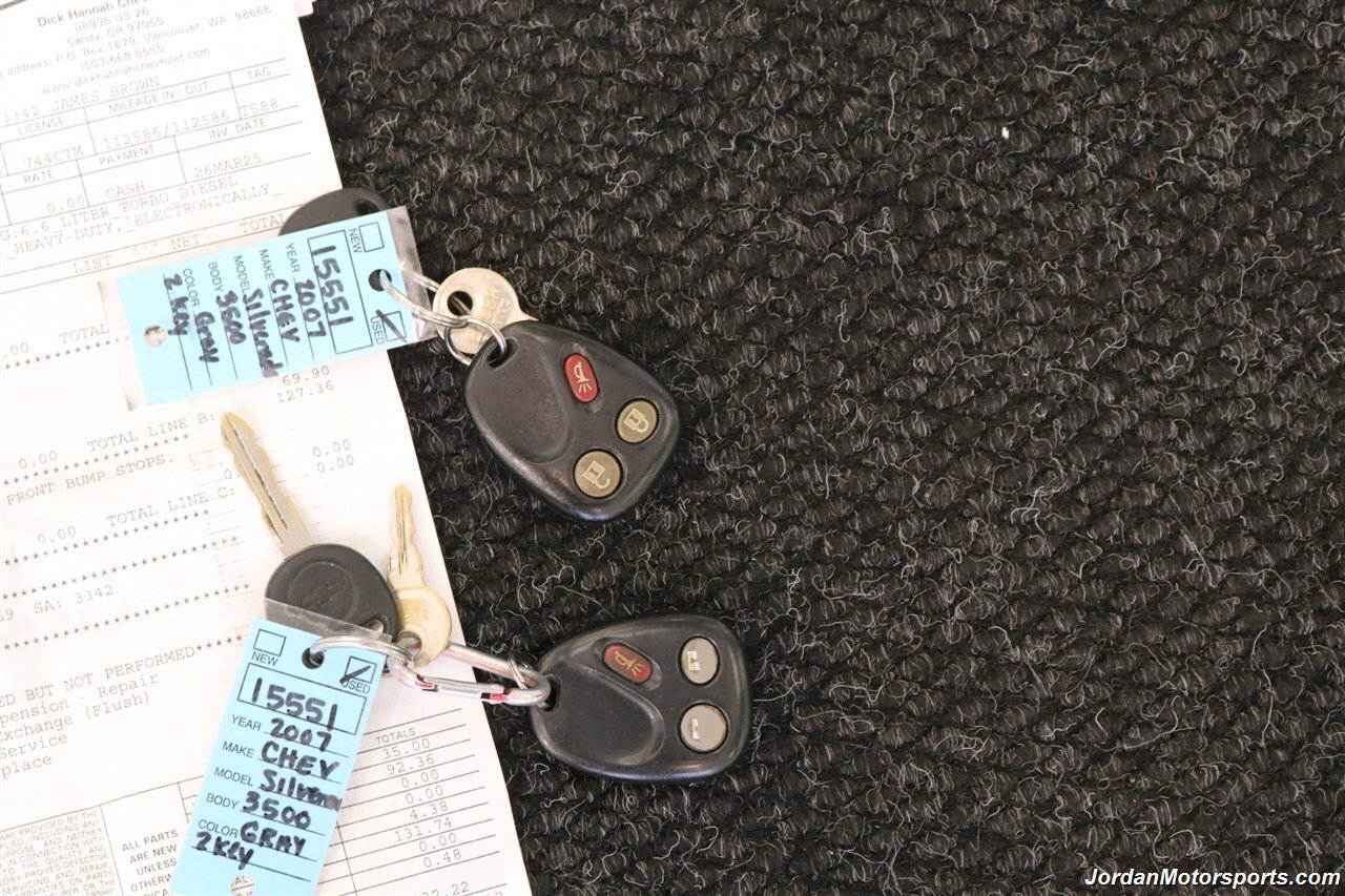 UP FOR GRABS IS A SUPER HARD TO FIND IN THIS SHAPE AND CONDITION AND LOW MILES LOCAL OREGON 2-OWNER SINCE NEW CLEAN TITLE AND CARFAX CERTIFIED FRESH TRADE IN 2007 CHEVROLET SILVERADO 3500 CLASSIC CREW CAB LONG BED 4X4 LT3 PACKAGE LOADED WITH EVERY OPTION FROM GM FOR THE YEAR INCLUDING MOON ROOF, POWER HEATED SEATS, FOG LIGHTS, TRAILER BRAKES, EXTENDABLE TOWING MIRRORS, RUNNING BOARDS, SPRAY IN BED LINER, PAINT MATCHED CANOPY, ALLOY WHEELS, TINTED WINDOWS, BOSE SOUND SYSTEM AND MUCH MORE. NO SIGNS OR RECORDS OF ANY ACCIDENTS EVER, NO MAJOR DENTS OR SCRATCHES AT ALL IF ANY, LIKE NEW INTERIOR FREE OF ANY RIPS OR TEARS OR ANY BROKEN PLASTICS OR STAINS WHAT SO EVER. THIS SILVERADO HAS NEVER BEEN DRIVEN OFF ROAD OR IN MUD OR SNOW AT ALL, THE UNDER CARRIAGE IS 100% RUST & CORROSION FREE, IT IS SUPER CLEAN. WE JUST DID A NEW 2.5" LEVELING KIT WITH ALL NEW BILSTEIN 5100 SERIES SHOCKS ALL THE WAY AROUND, WE ALSO INSTALLED A NEW SET OF 33" BF GOODRICH KO3 10-PLY TIRES ALL THE WAY AROUND. THIS SILVERADO HAS ALWAYS BEEN SERVICED AT CHEVY DEALER SINCE NEW AND COMES WITH ALL DETAILED RECORDS ON CARFAX, WE ALSO JUST HAD A FRESH SERVICE DONE INCLUDING FRESH OIL CHANGE & FILTER / NEW AIR FILTER / NEW FUEL FILTER / REPLACED IDLER ARM & BRACKET / NEW INTERMEDIATE STEERING SHAFT / AC RECHARGE / NEW BATTERIES / COOLANT FLUSH AND MORE.