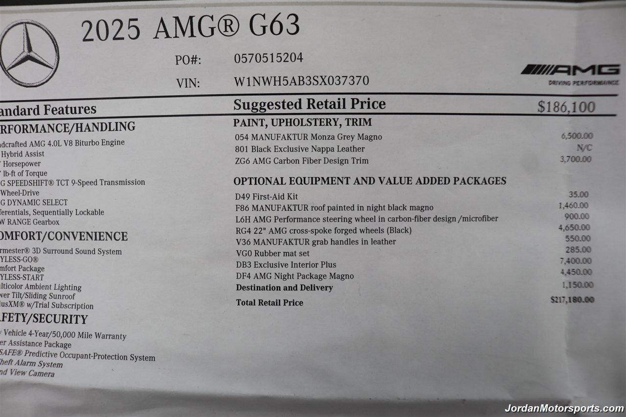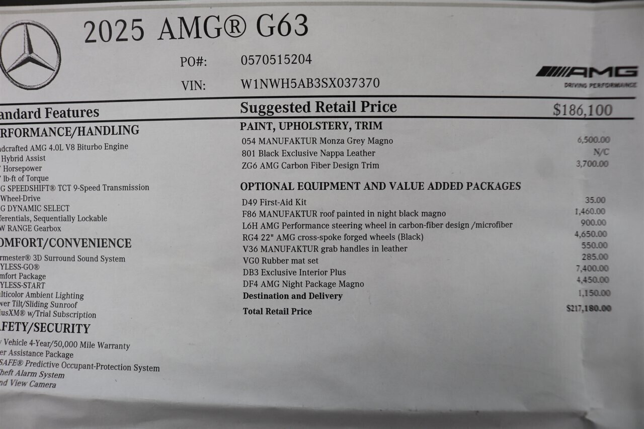 UP FOR GRABS IS HARD TO FIND IN THIS SHAPE AND CONDITION AND BUILD SPEC LOCAL OREGON ONE OWNER CLEAN TITLE AND CARFAX CERTIFIED WITH A SUPER NICE SPEC 2025 MERCEDES G 63 WITH AN ORIGINAL MSRP OF $217K, LOADED WITH GREAT OPTIONS, MANUFAKTUR MONZA GREY MAGNO EXTERIOR PAINT WITH AMG CARBON FIBER DESIGN TRIM PACKAGE, MANUFAKTUR ROOF PAINTED IN NIGHT BLACK MAGNO / AMG PERFORMANCE STEERING WHEEL IN CARBON-FIBER DESIGN - MICROFIBER / 22" AMG CROSS-SPOKE FORGED WHEELS / MANUFAKTUR GRAB HANDLES IN LEATHER / EXCLUSIVE INTERIOR PLUS PKG / AMG NIGHT PACKAGE MAGNO AND MUCH MORE. THIS G63 HAS FULL FRONT HOOD -FENDERS XPEL PPF COVERAGE SINCE NEW ALONG WITH A FEW IMPORTANT SPOTS AS WELL, COMES WITH ALL ORIGINAL BOOKS - MANUALS - ORIGINAL WINDOW STICKER AND ALL KEYS.